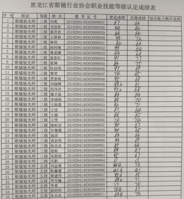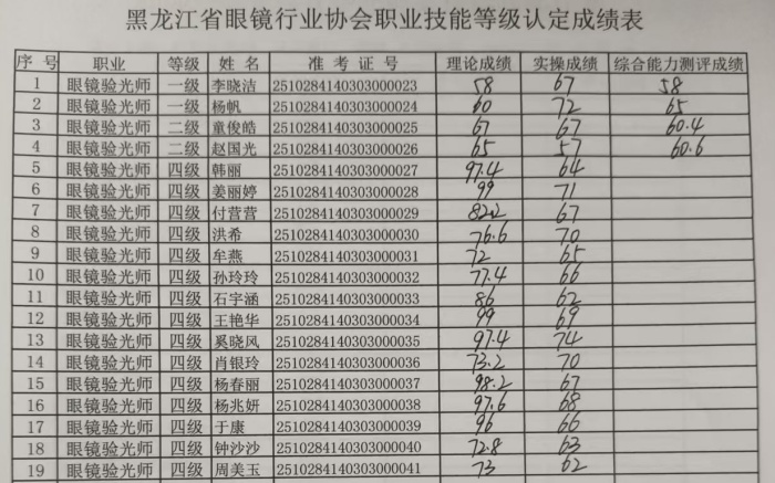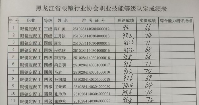 2025年10月28和29日黑龙江省眼镜行业协会职业技能等级认定成绩单
